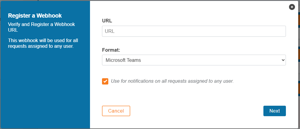 In the Webhooks table, click on the + button. In the form, paste the url that you retrieved from Microsoft Teams and change the format to "Teams". For fleets or owner/operators, you can optionally have the system use this channel on all request for all users or just your own service requests.